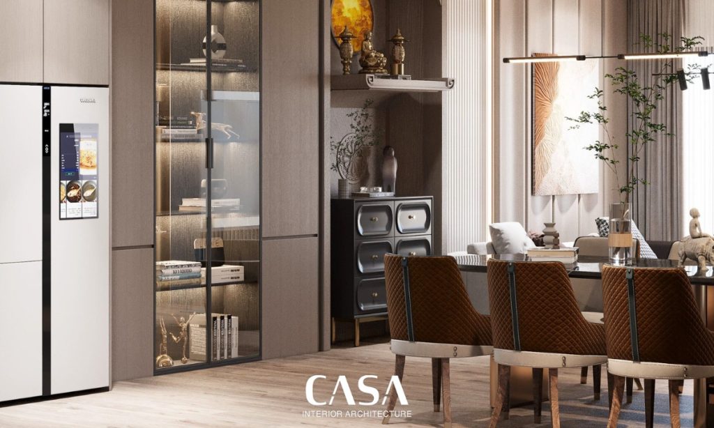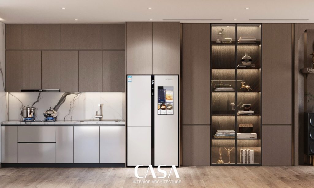 Tủ âm tường cao kịch trần, tích hợp cả khu vực trưng bày và lưu trữ giúp tối ưu diện tích mà không phá vỡ bố cục thẩm mỹ. Sắc nâu, be và trắng kết hợp với ánh sáng tự nhiên tạo nên một tổ hợp dịu dàng – nơi mỗi buổi sáng đều bắt đầu nhẹ nhàng và đầy cảm hứng.
