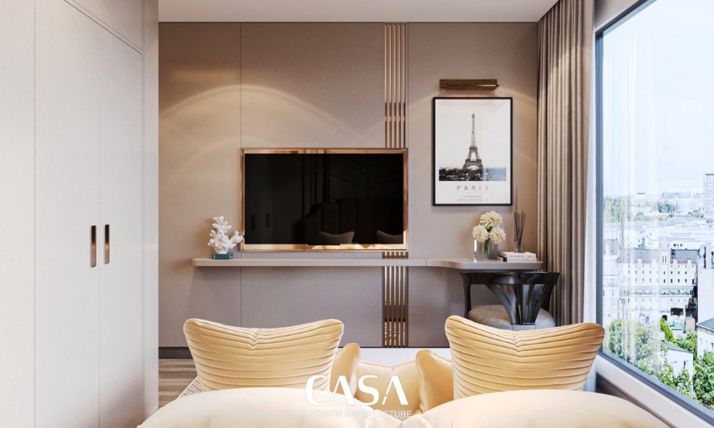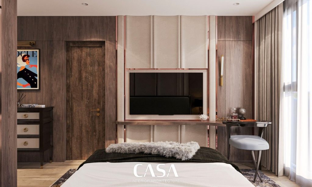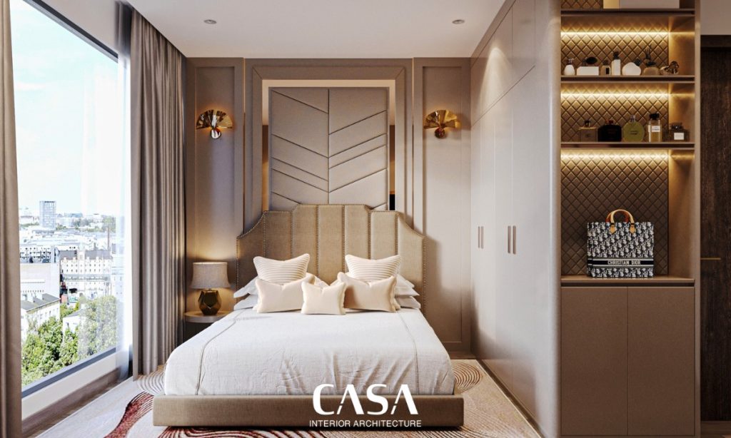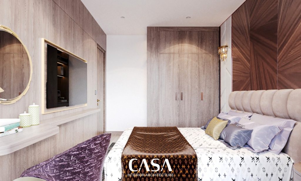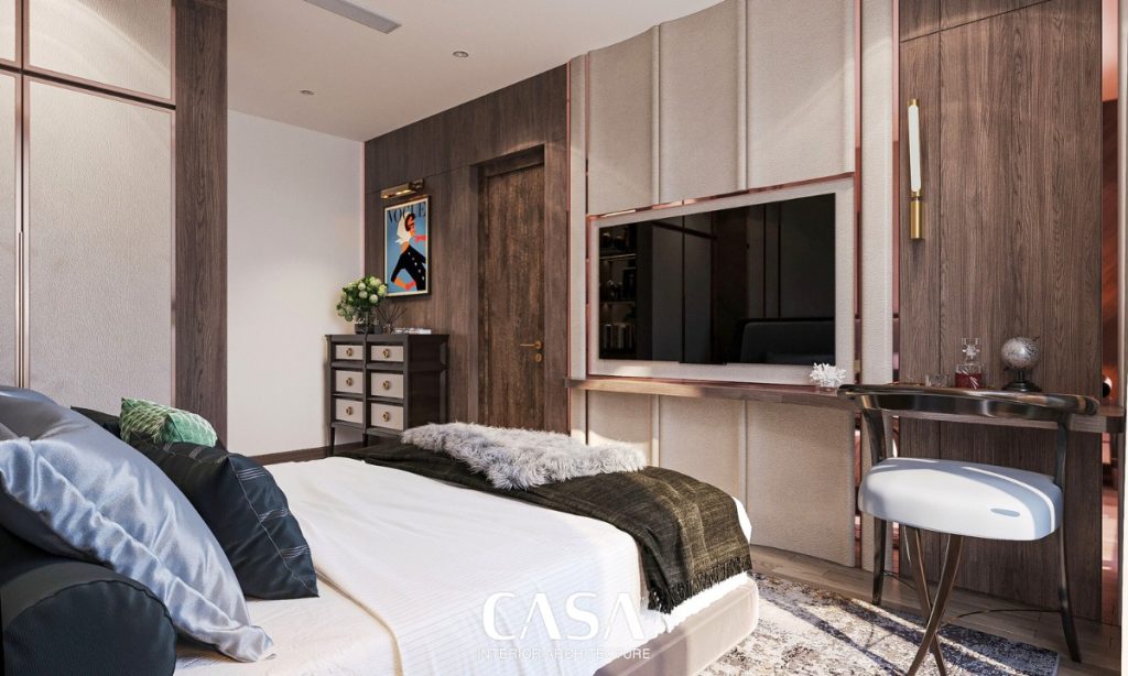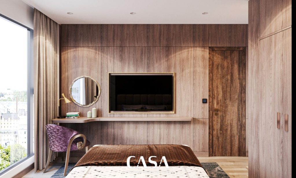 Đặt cạnh logia, phòng ngủ chính mang lại cảm giác thư giãn ngay từ ánh nhìn đầu tiên. Hệ vách đầu giường được xử lý cầu kỳ với mảng ốp veneer đối xứng, kết hợp đèn tường ánh vàng mang phong cách boutique hotel. Giường bọc nỉ êm ái, hệ rèm 2 lớp, bàn phấn nhỏ gọn – tất cả được thiết kế để phục vụ một mục đích: nghỉ ngơi trọn vẹn.