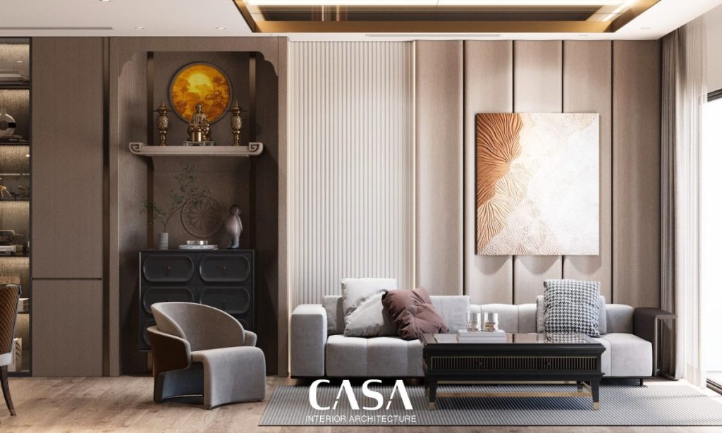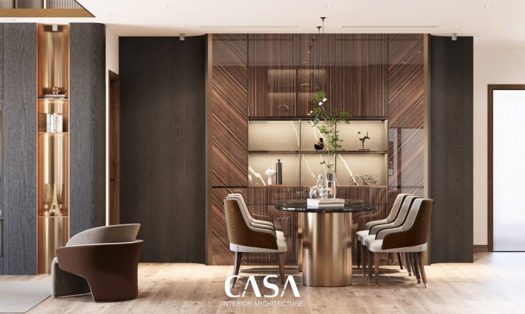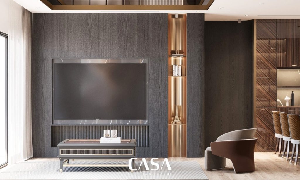 Vách TV được thiết kế đơn giản với lớp ốp gỗ tối màu kết hợp các đường soi dọc nhẹ nhàng, giúp không gian trở nên chiều sâu hơn mà không gây nặng nề. Hệ kệ trưng bày ánh đồng bên cạnh chính là điểm nhấn cá tính: tinh tế, sang trọng nhưng vẫn mềm mại, đủ sức phản ánh gu thẩm mỹ riêng của gia chủ.